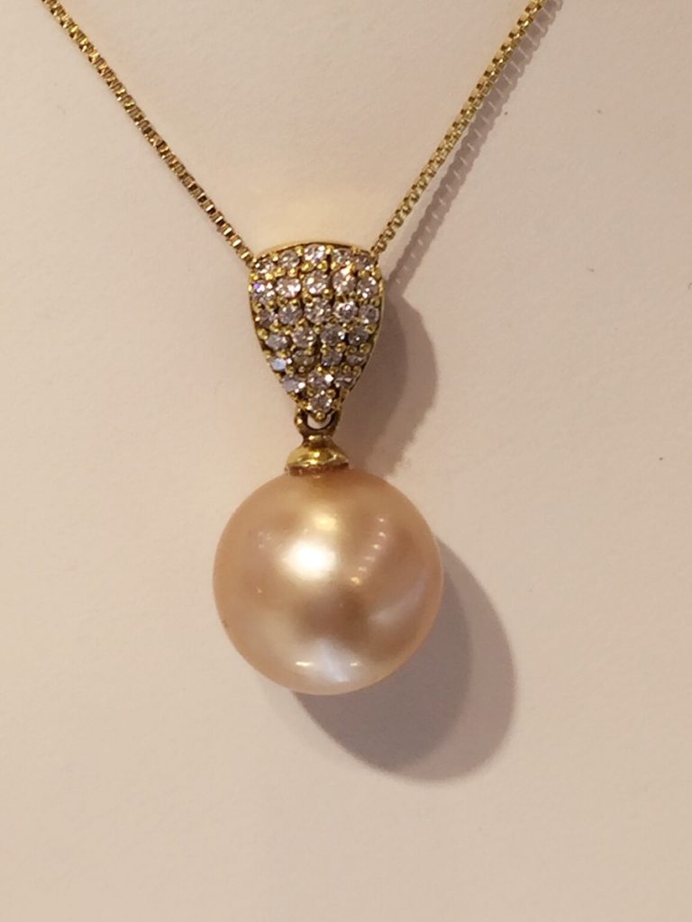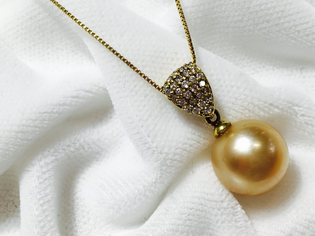 Our beautiful K18 Golden Southsea Pearl Necklace, with sparkling side diamonds, comes with a K18 Yellow Gold Chain. Circumferencing at 10mm-11mm, you will be stunned at its gorgeous lustre and rounded size.